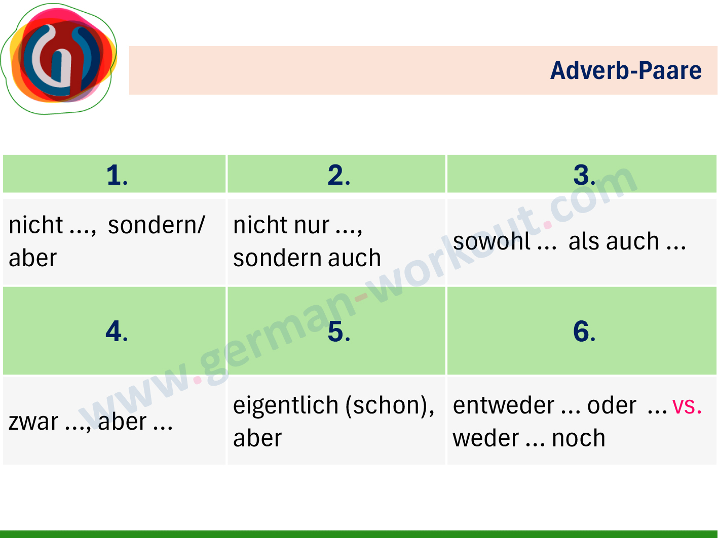 At A2 level, the information on adverbs is practiced specifically with the questions “when, why, how, where/wherefrom/where to“. Adverb pairs are only addressed and specifically trained from B1 level in German, even if they are used occasionally at earlier language levels.