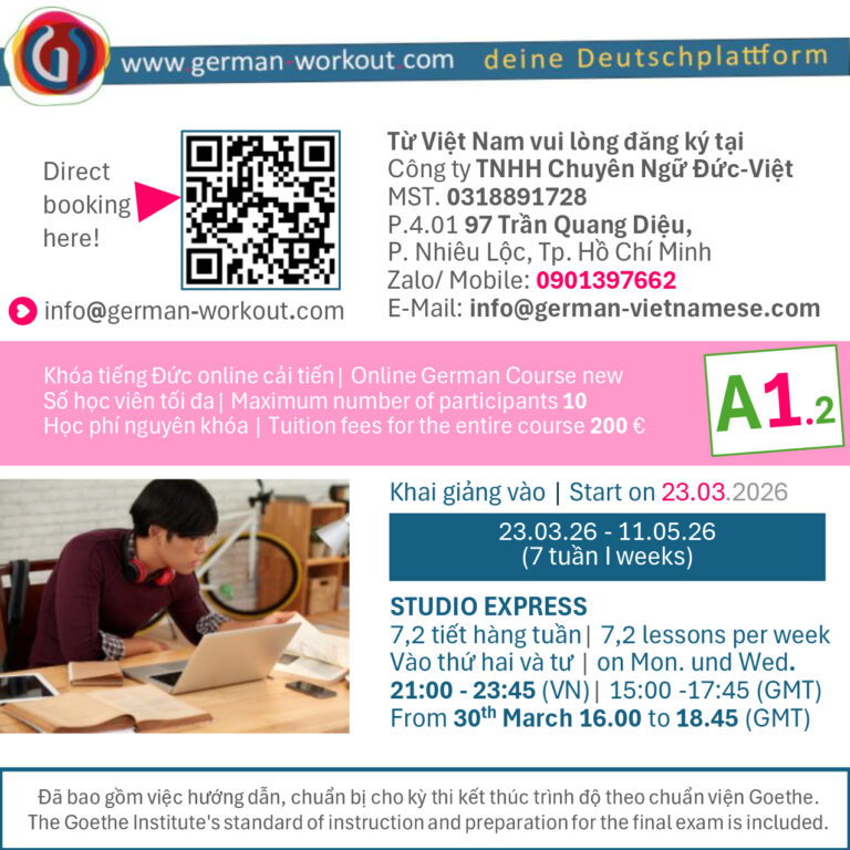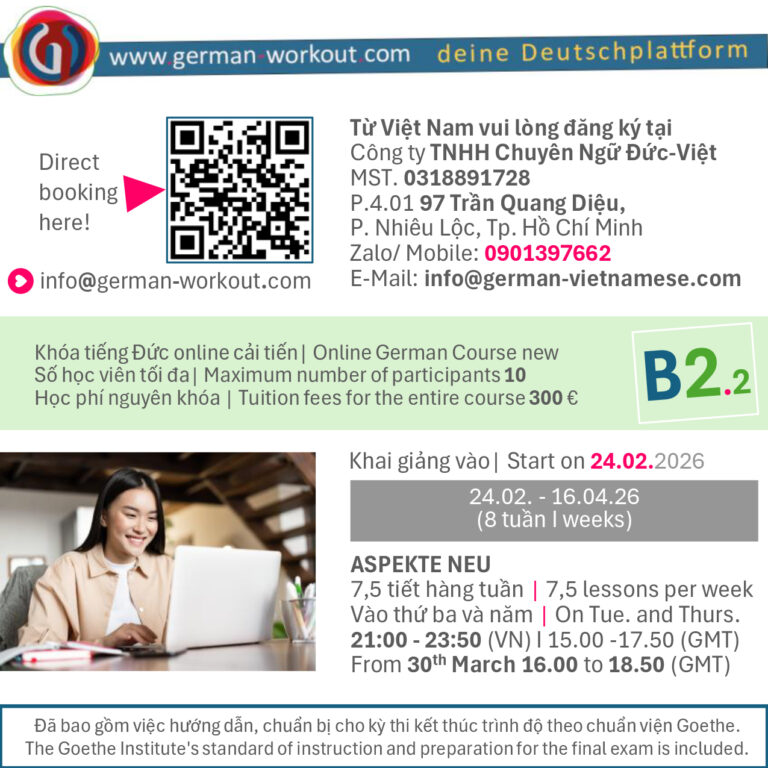 Số học viên tối đa | Maximum number of participants 10 Học phí nguyên khóa | Tuition fees for the entire course 600 € Học phí đóng 6 tuần một lần | Tuition fee per 06-week interval 300 € Khai giảng vào | Start on: 24.02.2026 (24.02.26-16.04.26) ASPEKTE NEU10 tiết hàng tuần | 10 lessons […]