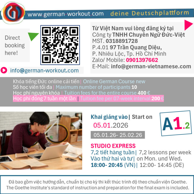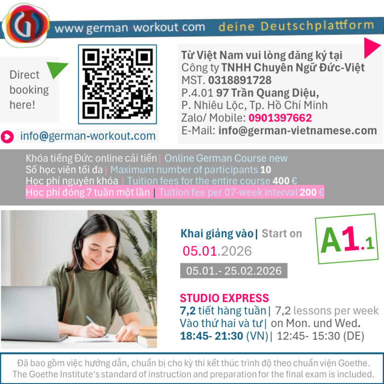 Số học viên tối đa| Maximum number of participants 10 Học phí nguyên khóa | Tuition fees for the entire course 400 € Học phí đóng 7 tuần một lần | Tuition fee per 07-week interval 200 € Khai giảng vào| Start on: 05.01.2026 (05.01.26-25.02.26) 7,2 tiết hàng tuần| 7,2 lessons per weekThứ hai 18:45-21:30 […]