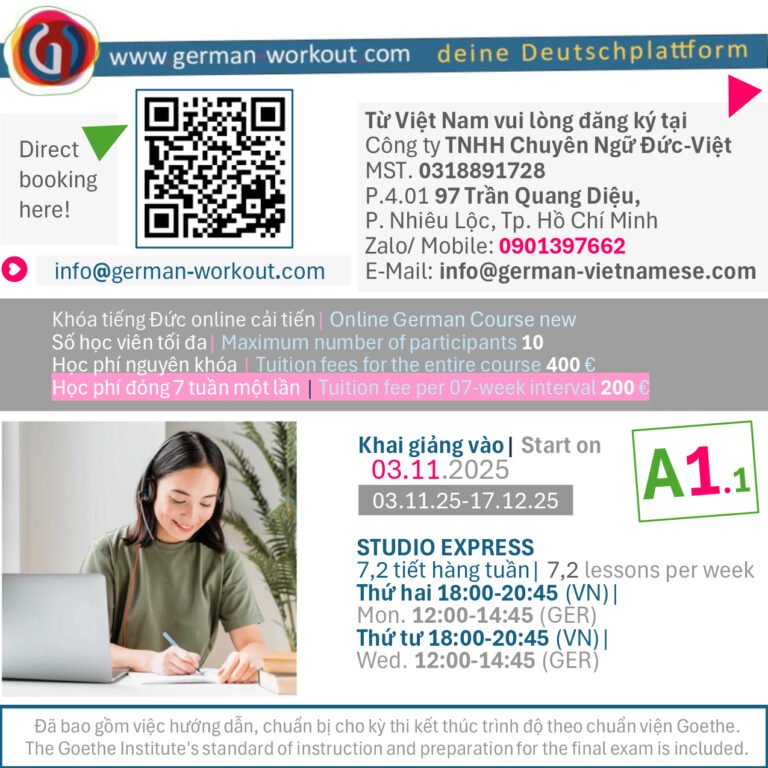 Số học viên tối đa| Maximum number of participants 10 Học phí nguyên khóa | Tuition fees for the entire course 400 € Học phí đóng 7 tuần một lần | Tuition fee per 07-week interval 200 € Khai giảng vào| Start on: 03.11.2025 (03.11.25-17.12.25) 7,2 tiết hàng tuần| 7,2 lessons per weekThứ hai 18:00-20:45 […]