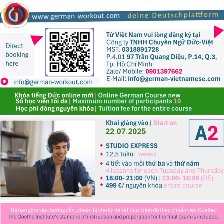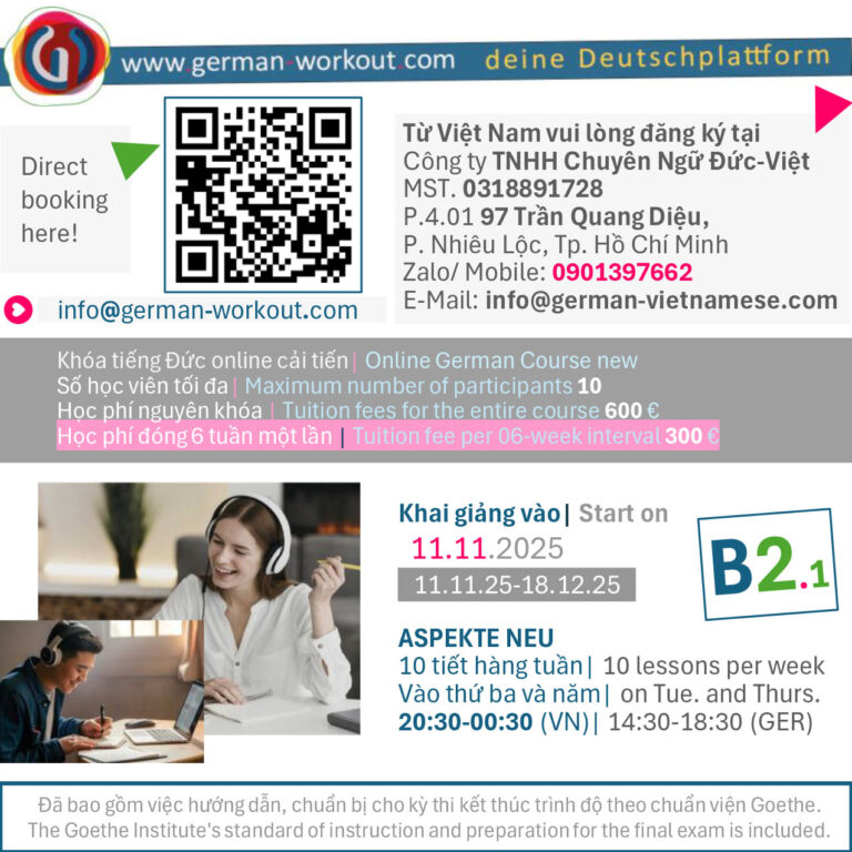 Số học viên tối đa| Maximum number of participants 10 Học phí nguyên khóa | Tuition fees for the entire course 400 € Học phí đóng 7 tuần một lần | Tuition fee per 07-week interval 200 € Khai giảng vào| Start on: 03.11.2025 (03.11.25-17.12.25) 7,2 tiết hàng tuần| 7,2 lessons per weekThứ hai 18:00-20:45 […]