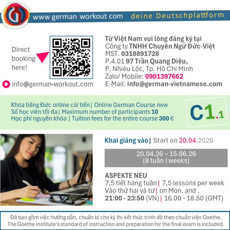 Số học viên tối đa | Maximum number of participants 10 Học phí nguyên khóa | Tuition fees for the entire course 600 € Học phí đóng 6 tuần một lần | Tuition fee per 06-week interval 300 € Khai giảng vào | Start on: 11.11.2025 (11.11.25-18.12.25) ASPEKTE NEU10 tiết hàng tuần | 10 lessons […]
